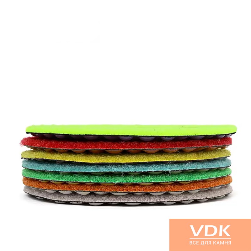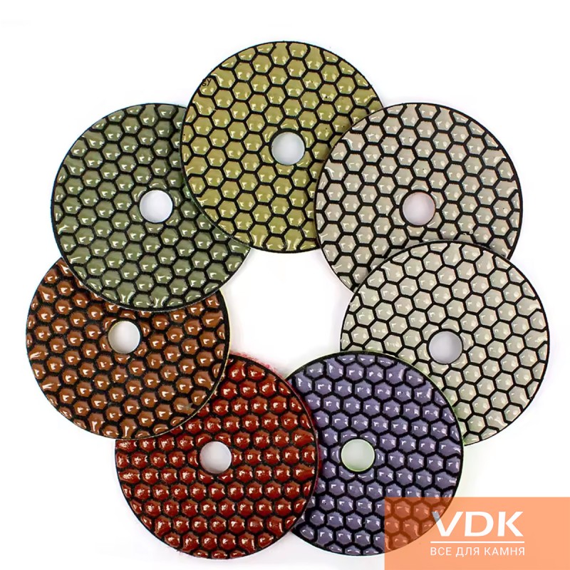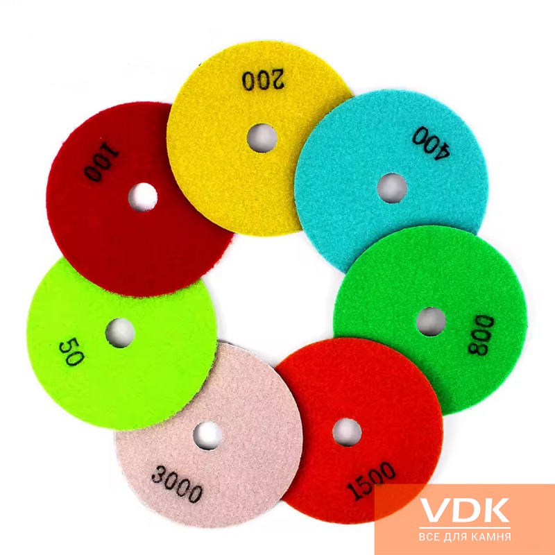 Flex perfectly polished dry with no water supply. Complete the polishing cycle comprises 7 rooms of different diamond grit, which filled a binder. Flex presents a diameter of 100 for hand grinders, mounting method, "Velcro", because of this, you can quickly and easily change the number. FLEX can work for a Bulgarian, as to them has a holder with fastening M14.